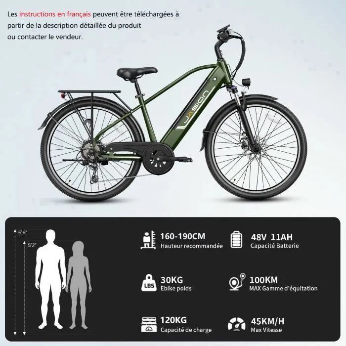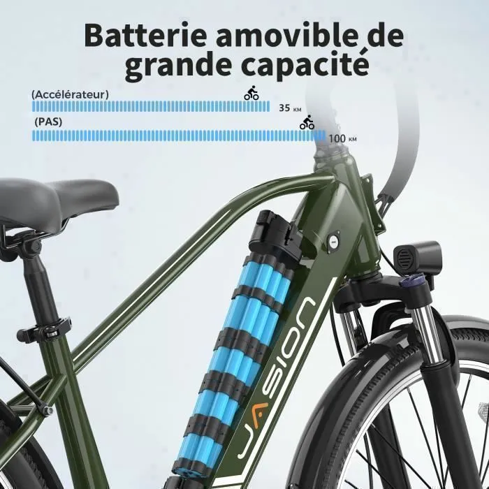 Nom du produit JASION Vélo électrique 26″ Vert – Batterie amovible 48V/11Ah -Moteur 750 W-Shimano 7 Vitesses-Ville E-Bike -Vélo de Trekking