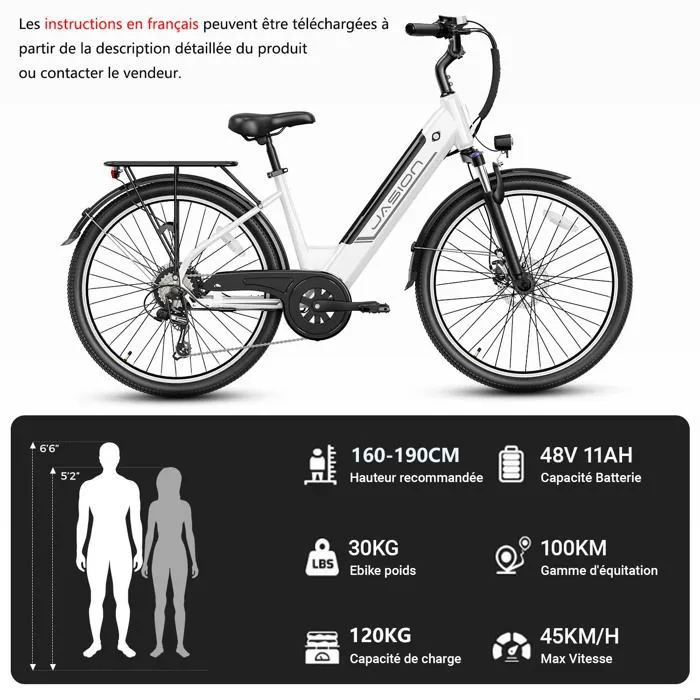 | Nom du produit | Vélo Électrique – JASION 26″ – Roamer – 750W – Batterie Amovible 48V 11Ah – Shimano 7 Vitesses – Pédalage Assisté- Panier avant |