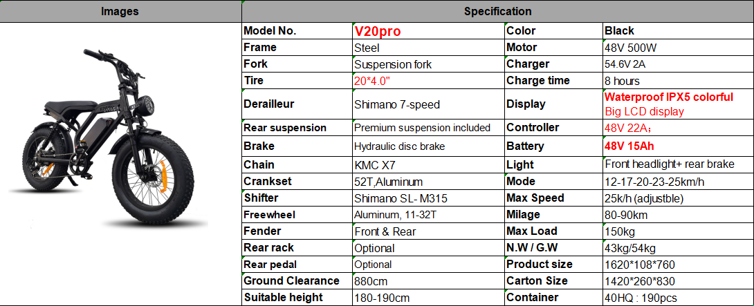 Vélo Électrique V20pro – Haute Performance & Confort UltimeModèle : V20pro | Couleur : Noir CarboneConfiguration Technique Avancée :1.Moteur Puissant : 500W (48V) avec contrôleur intelligent 22A2. Autonomie Record : Batterie lithium 48V 15Ah (80-90 km par charge)3. Système Suspension Premium : Fourche à suspension + amortisseur arrière haut de gamme4. Freinage Expert : Freins à disque hydrauliques double circuit5. Transmission Pro : Dérailleur Shimano 7 vitesses + pédalier KMC X76. Équipement Sécurité : Éclairage LED avant/arrière IPX5 + pneus 20″*4.0″ anti-crevaison